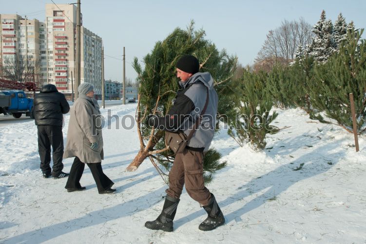 Продавец елок, привезенных из Александровского лесничества в Запорожской области, в понедельник, 24 декабря 2012 г. В эти дни в Александровском лесничестве завершается вырубка елок, которые отправятся на елочные базары. В лесничестве выращивают крымскую сосну, которая успешно прижилась на Запорожской земле. Фото Александра Прилепы / УНИАН