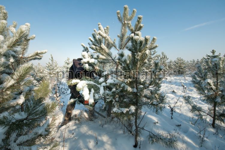Мужчина спиливает сосну на территории Александровского лесничества в Запорожской области, в понедельник, 24 декабря 2012 г. В эти дни в Александровском лесничестве завершается вырубка елок, которые отправятся на елочные базары. В лесничестве выращивают крымскую сосну, которая успешно прижилась на Запорожской земле. Фото Александра Прилепы / УНИАН