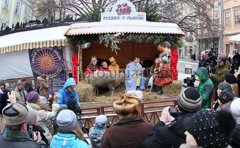 Живая рождественская шопка во Львове, в воскресенье, 6 января 2013 г. В преддверие Рождества во Львове на площади Рынок начинает работать уже традиционная живая рождественская шопка - с живыми персонажами рождественского действа и настоящими животными. На протяжении всех трех дней празднования Рождества на площади Рынок можно будет встретить Иосифа и Марию, трех Царей, ангела и пастушков с овцами, волами и осликом. Фото УНИАН