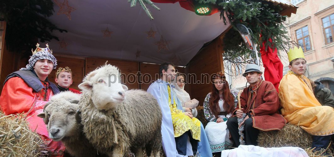 Живая рождественская шопка во Львове, в воскресенье, 6 января 2013 г. В преддверие Рождества во Львове на площади Рынок начинает работать уже традиционная живая рождественская шопка - с живыми персонажами рождественского действа и настоящими животными. На протяжении всех трех дней празднования Рождества на площади Рынок можно будет встретить Иосифа и Марию, трех Царей, ангела и пастушков с овцами, волами и осликом. Фото УНИАН