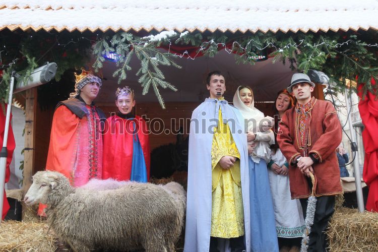Живая рождественская шопка во Львове, в воскресенье, 6 января 2013 г. В преддверие Рождества во Львове на площади Рынок начинает работать уже традиционная живая рождественская шопка - с живыми персонажами рождественского действа и настоящими животными. На протяжении всех трех дней празднования Рождества на площади Рынок можно будет встретить Иосифа и Марию, трех Царей, ангела и пастушков с овцами, волами и осликом. Фото УНИАН