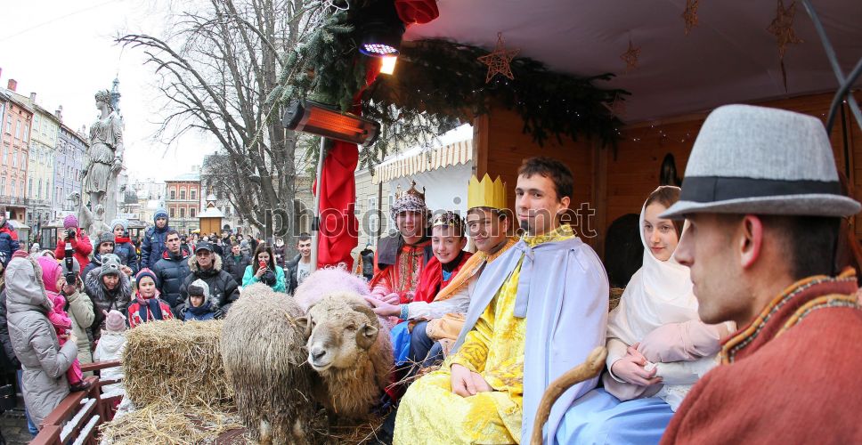 Живая рождественская шопка во Львове, в воскресенье, 6 января 2013 г. В преддверие Рождества во Львове на площади Рынок начинает работать уже традиционная живая рождественская шопка - с живыми персонажами рождественского действа и настоящими животными. На протяжении всех трех дней празднования Рождества на площади Рынок можно будет встретить Иосифа и Марию, трех Царей, ангела и пастушков с овцами, волами и осликом. Фото УНИАН