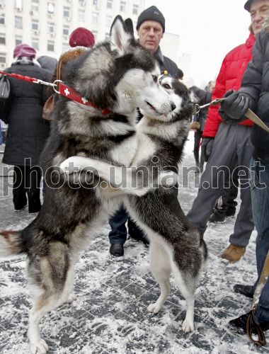 Собаки породы хаски во время Чемпионата Северных собак на НСК "Олимпийский", в Киеве, в субботу, 12 января 2013 г. В этот день на НСК «Олимпийский» для посетителей перед Старым Новым годом подготовили развлекательную программу: соревнования среди собак северных пород , мастер-класс по изготовлению кукол-оберегов и оригинальных украшений. В этот день также был открыт парк ледовых скульптур "Олимпийская зима". Фото Александра Синицы / УНИАН