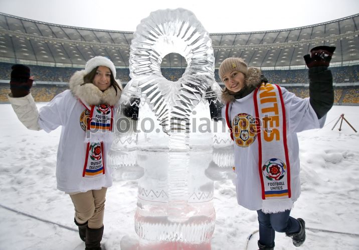 Девушки фотографируются возле ледовой скульптуры во время открытия парка ледовых скульптур "Олимпийская зима" на НСК "Олимпийский", в Киеве, в субботу, 12 января 2013 г. В этот день на НСК «Олимпийский» для посетителей перед Старым Новым годом подготовили развлекательную программу: соревнования среди собак северных пород , мастер-класс по изготовлению кукол-оберегов и оригинальных украшений. В этот день также был открыт парк ледовых скульптур "Олимпийская зима". Фото Александра Синицы / УНИАН