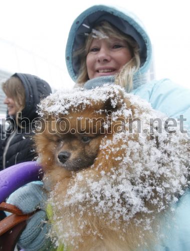 Женщина держит щенка породы шпиц во время Чемпионата Северных собак на НСК "Олимпийский", в Киеве, в субботу, 12 января 2013 г. В этот день на НСК «Олимпийский» для посетителей перед Старым Новым годом подготовили развлекательную программу: соревнования среди собак северных пород , мастер-класс по изготовлению кукол-оберегов и оригинальных украшений. В этот день также был открыт парк ледовых скульптур "Олимпийская зима". Фото Александра Синицы / УНИАН