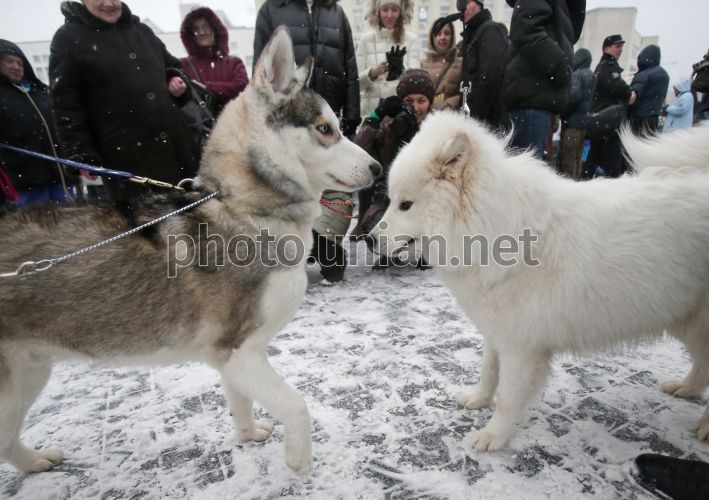 Собаки породы хаски и самоед во время Чемпионата Северных собак на НСК "Олимпийский", в Киеве, в субботу, 12 января 2013 г. В этот день на НСК «Олимпийский» для посетителей перед Старым Новым годом подготовили развлекательную программу: соревнования среди собак северных пород , мастер-класс по изготовлению кукол-оберегов и оригинальных украшений. В этот день также был открыт парк ледовых скульптур "Олимпийская зима". Фото Александра Синицы / УНИАН