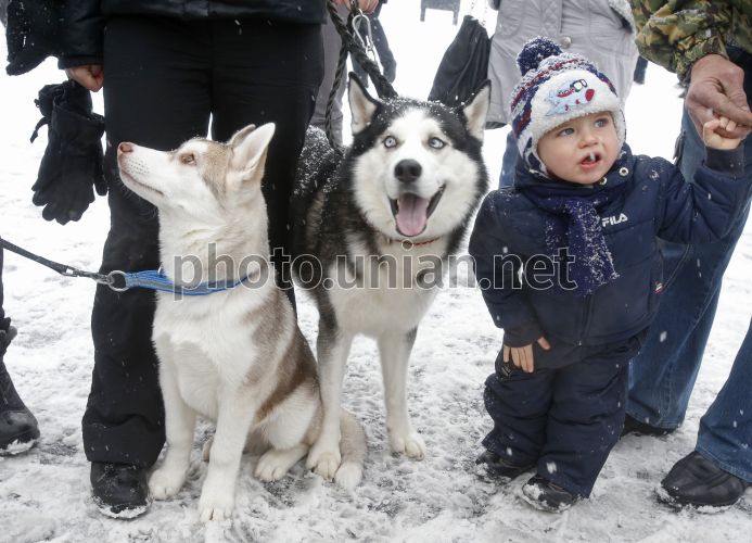 Мальчик возле собак породы хаски во время Чемпионата Северных собак на НСК "Олимпийский", в Киеве, в субботу, 12 января 2013 г. В этот день на НСК «Олимпийский» для посетителей перед Старым Новым годом подготовили развлекательную программу: соревнования среди собак северных пород , мастер-класс по изготовлению кукол-оберегов и оригинальных украшений. В этот день также был открыт парк ледовых скульптур "Олимпийская зима". Фото Александра Синицы / УНИАН