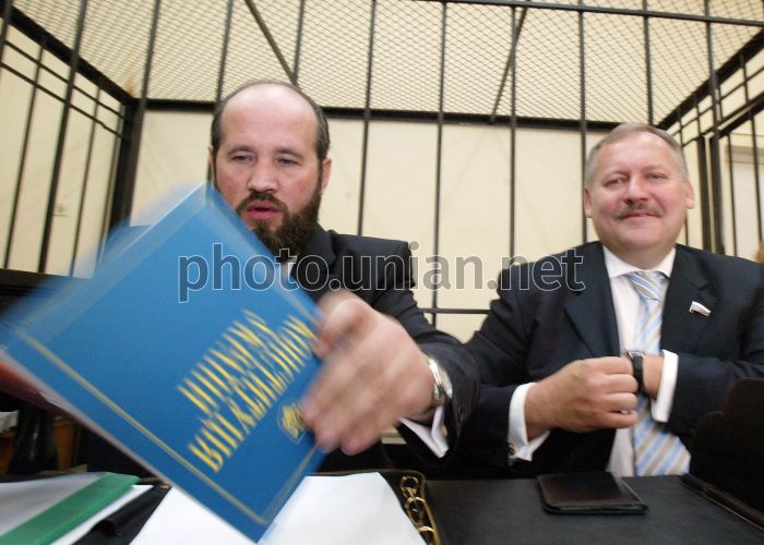 Директор Института стран СНГ, депутат Государственной думы России Константин Затулин, справа, общается со своим адвокатом Андреем Федуром во время заседания в Шевченковском районном суде г. Киева в четверг, 5 октября 2006 г. 3 июня 2006 г. СБУ приняла решение запретить Затулину въезд в Украину "как нежелательной персоне". СБУ мотивировала свое решение действиями и поступками Затулина, который принимал участие в акциях протеста против проведения международных военных учений в Феодосии, направленных на разрушение целостности государства Украина. Затулин подал жалобу в суд на СБУ и высказал уверенность, что выиграет его, а также отметил, что решение о запрете ему во въезде в Украину было принято по политическим мотивам. Фото Сергея Светлицкого / УНИАН