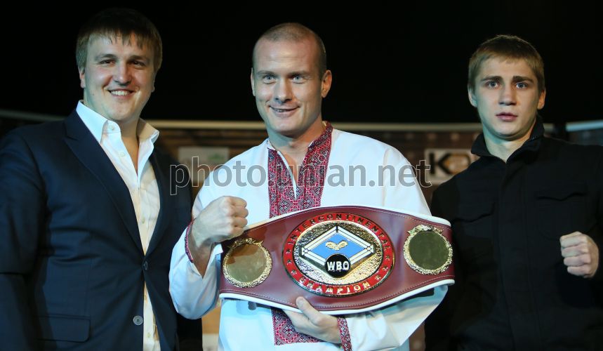 Интерконтинентальный чемпион по версии WBO в полутяжелом весе Вячеслав Узелков, в центре, украинский боксер Александр Спирко, справа, и промоутер Вячеслава Узелкова, генеральный директор «K2 Promotions» Александр Красюк во время пресс-конференции перед боем со швейцарским боксером Софьян Себихи, в Киеве, в среду, 6 марта 2013 г. 16 марта 2013 г. в Киеве пройдет боксерское шоу компании братьев Кличко "K2 Promotions". В главном поединке вечера Интерконтинентальный чемпион по версии WBO в полутяжелом весе Вячеслав Узелков проведет защиту титула. Фото Владимира Гонтара / УНИАН