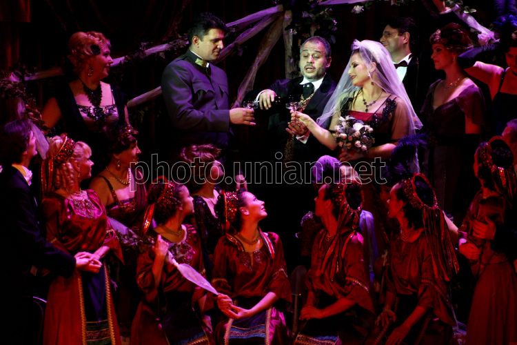 Сцена из оперетты Имре Калмана "Сильва" ("Королева чардаша") в исполнении актеров Будапештского оперного театра на сцене Закарпатского областного украинского музыкально-драматического театра им. братьев Шерегиев, в Ужгороде, в среду, 3 апреля 2013 г. Фото Яноша Немеша / УНИАН