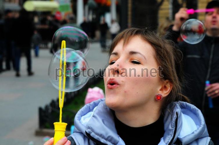 Девушка пускает мыльные пузыри во время проведения ежегодной акции "День мыльных пузырей" в Одессе, в воскресенье, 7 апреля 2013 г. Фото Александра Шепелева / УНИАН