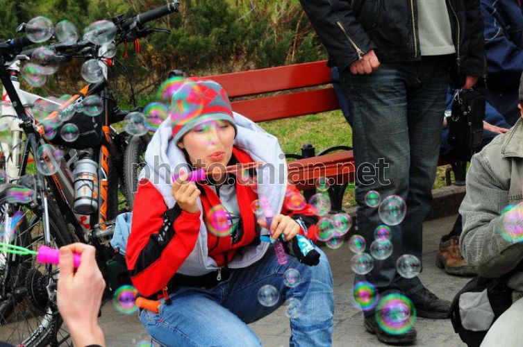 Девушка пускает мыльные пузыри во время проведения ежегодной акции "День мыльных пузырей" в Одессе, в воскресенье, 7 апреля 2013 г. Фото Александра Шепелева / УНИАН
