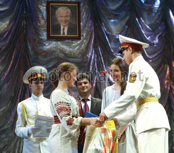 Дочь экс-премьер-министра Украины Юлии Тимошенко Евгения, вторая справа, вручает награду победителям Международного конкурса по украинскому языку им. Петра Яцика, в Киеве, в среду, 15 мая 2013 г. В этот день победителям Международного конкурса знатоков украинского языка имени Петра Яцика были вручены премии от лидера оппозиции Юлии Тимошенко. Вручила премии от Тимошенко дочь лидера оппозиции Евгения. Она поздравила 11 молодых языковедов и их наставников со всей Украины. Е.Тимошенко также зачитала письмо от экс-премьера, которая находится в харьковской больнице «Укрзализныци». Фото Александра Прокопенко / POOL / УНИАН