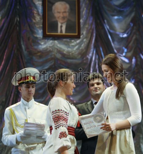 Дочь экс-премьер-министра Украины Юлии Тимошенко Евгения, справа, вручает награду победителям Международного конкурса по украинскому языку им. Петра Яцика, в Киеве, в среду, 15 мая 2013 г. В этот день победителям Международного конкурса знатоков украинского языка имени Петра Яцика были вручены премии от лидера оппозиции Юлии Тимошенко. Вручила премии от Тимошенко дочь лидера оппозиции Евгения. Она поздравила 11 молодых языковедов и их наставников со всей Украины. Е.Тимошенко также зачитала письмо от экс-премьера, которая находится в харьковской больнице «Укрзализныци». Фото Александра Прокопенко / POOL / УНИАН