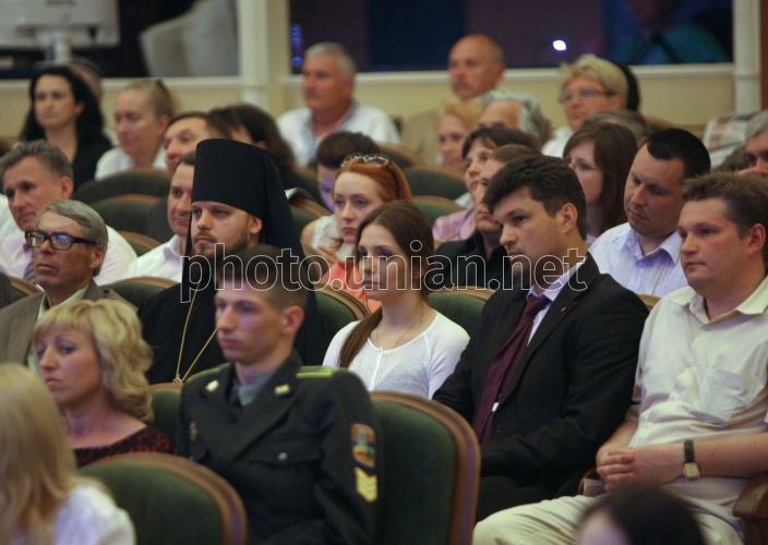 Дочь экс-премьер-министра Украины Юлии Тимошенко Евгения, в центре, сидит в зале во время вручения наград победителям Международного конкурса по украинскому языку им. Петра Яцика, в Киеве, в среду, 15 мая 2013 г. В этот день победителям Международного конкурса знатоков украинского языка имени Петра Яцика были вручены премии от лидера оппозиции Юлии Тимошенко. Вручила премии от Тимошенко дочь лидера оппозиции Евгения. Она поздравила 11 молодых языковедов и их наставников со всей Украины. Е.Тимошенко также зачитала письмо от экс-премьера, которая находится в харьковской больнице «Укрзализныци». Фото Александра Прокопенко / POOL / УНИАН
