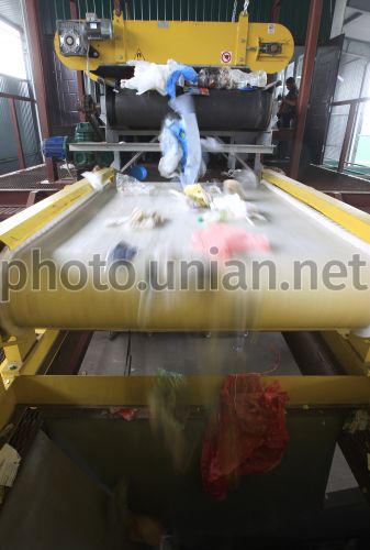 В одном из цехов нового производственного комплекса по сортировке отходов ГП "Укрекоресурсы", в Киеве, в четверг, 6 июня 2013 г. Новая сортировочная линия мощностью в 65 тысяч тонн твердых бытовых отходов в год в значительной степени повлияет на возможность полноценной переработки вторичного сырья в Киеве. Фото Евгения Малолетки / УНИАН