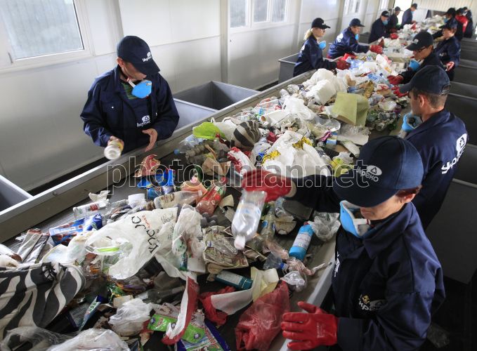 Рабочие на территории нового производственного комплекса по сортировке отходов ГП "Укрекоресурсы", в Киеве, в четверг, 6 июня 2013 г. Новая сортировочная линия мощностью в 65 тысяч тонн твердых бытовых отходов в год в значительной степени повлияет на возможность полноценной переработки вторичного сырья в Киеве. Фото Евгения Малолетки / УНИАН
