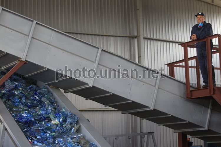 Рабочий на территории нового производственного комплекса по сортировке отходов ГП "Укрекоресурсы", в Киеве, в четверг, 6 июня 2013 г. Новая сортировочная линия мощностью в 65 тысяч тонн твердых бытовых отходов в год в значительной степени повлияет на возможность полноценной переработки вторичного сырья в Киеве. Фото Евгения Малолетки / УНИАН