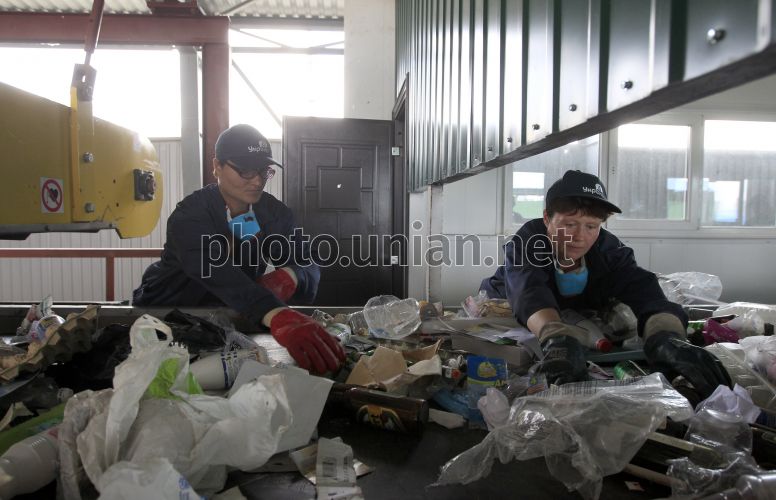 Рабочие на территории нового производственного комплекса по сортировке отходов ГП "Укрекоресурсы", в Киеве, в четверг, 6 июня 2013 г. Новая сортировочная линия мощностью в 65 тысяч тонн твердых бытовых отходов в год в значительной степени повлияет на возможность полноценной переработки вторичного сырья в Киеве. Фото Евгения Малолетки / УНИАН