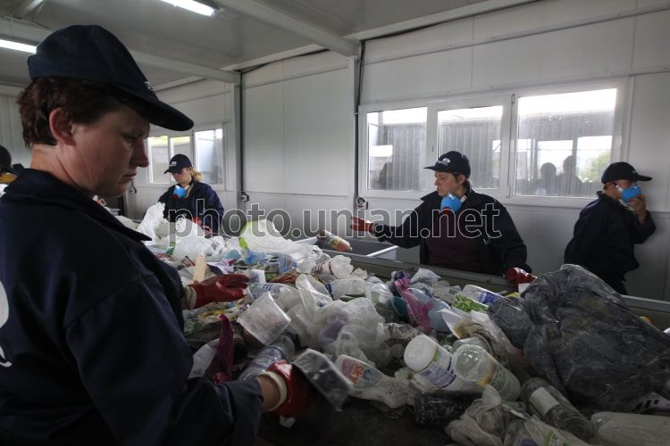 Рабочие на территории нового производственного комплекса по сортировке отходов ГП "Укрекоресурсы", в Киеве, в четверг, 6 июня 2013 г. Новая сортировочная линия мощностью в 65 тысяч тонн твердых бытовых отходов в год в значительной степени повлияет на возможность полноценной переработки вторичного сырья в Киеве. Фото Евгения Малолетки / УНИАН