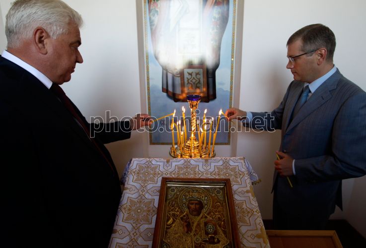 Председатель Киевской областной государственной администрации Анатолий Присяжнюк, слева, и вице-премьер-министр Украины Александр Вилкул во время богослужения по случаю открытия TIR-паркинга для большегрузного автотранспорта внутреннего и международного назначения на кольцевой дороге Борисполь - Бровары в Киевской области, в четверг, 17 июля 2013 г. В этот день Александр Вилкул открыл TIR-паркинг для большегрузного транспорта. Паркинг рассчитан на стоянку 50 большегрузных автотранспортных средств. Стоянка занимает площадь более 10 тыс. кв. м, а общая площадь всего комплекса 4 га. Фото Владислава Мусиенко / УНИАН