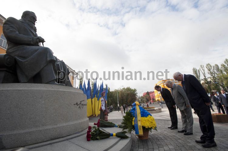 Слева направо: председатель КГГА Александр Попов, председатель Верховной Рады Украины Владимир Рыбак и премьер-министр Украины Николай Азаров во время возложения цветов к памятнику Михаилу Грушевскому, в Киеве, в субботу, 24 августа 2013 г. В День Независимости Украины руководство государства возложило цветы к памятникам Тарасу Шевченко и Михаилу Грушевскому. Фото Анастасиии Сироткиной / POOL / УНИАН