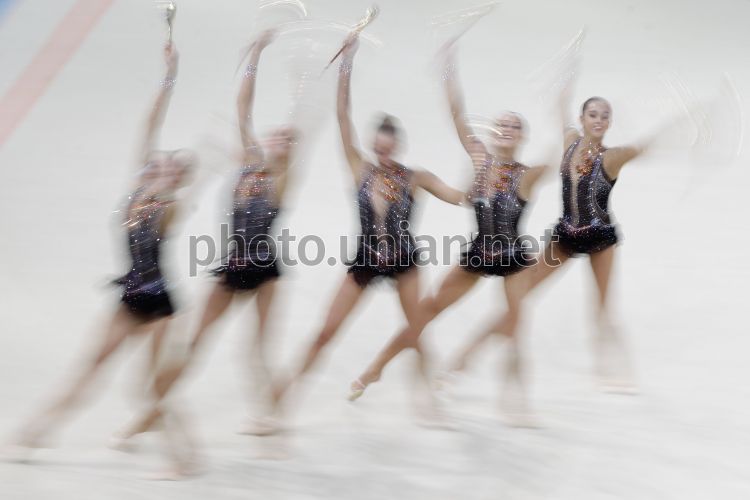 Гимнастки из сборной Италии выступают на чемпионате мира по художественной гимнастике, в Киеве, в субботу, 31 августа 2013 г. В Киеве прошел четвертый день соревнований по художественной гимнастике. Группы гимнасток из 29 стран мира демонстрировали на ковре свое мастерство в упражнениях с 10 булавами, 3 мячами и 2 лентами. "Золото" завоевала сборная Беларуси. Второй результат показали итальянки, третий - спортсменки из России. Чемпионат мира по художественной гимнастике проходил в Киеве с 27 августа по 1 сентября. Фото Евгения Малолетки / УНИАН