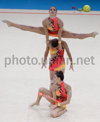 Гимнастки из сборной Испании выступают на чемпионате мира по художественной гимнастике, в Киеве, в субботу, 31 августа 2013 г. В Киеве прошел четвертый день соревнований по художественной гимнастике. Группы гимнасток из 29 стран мира демонстрировали на ковре свое мастерство в упражнениях с 10 булавами, 3 мячами и 2 лентами. "Золото" завоевала сборная Беларуси. Второй результат показали итальянки, третий - спортсменки из России. Чемпионат мира по художественной гимнастике проходил в Киеве с 27 августа по 1 сентября. Фото Евгения Малолетки / УНИАН