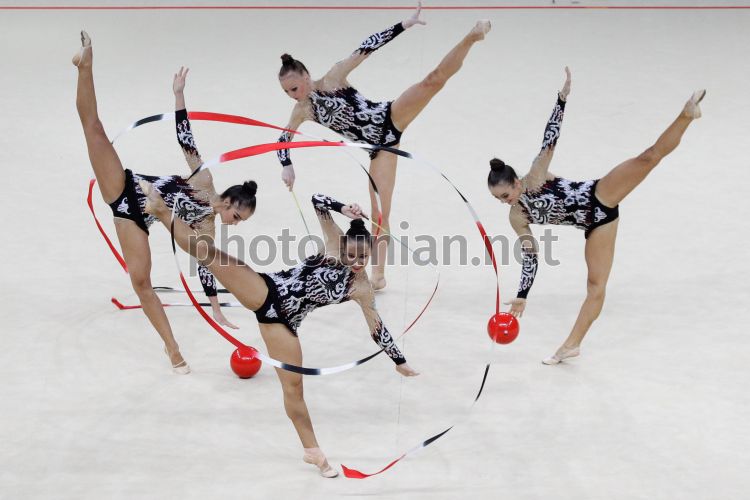 Гимнастки из сборной Узбекистана выступают на чемпионате мира по художественной гимнастике, в Киеве, в субботу, 31 августа 2013 г. В Киеве прошел четвертый день соревнований по художественной гимнастике. Группы гимнасток из 29 стран мира демонстрировали на ковре свое мастерство в упражнениях с 10 булавами, 3 мячами и 2 лентами. "Золото" завоевала сборная Беларуси. Второй результат показали итальянки, третий - спортсменки из России. Чемпионат мира по художественной гимнастике проходил в Киеве с 27 августа по 1 сентября. Фото Евгения Малолетки / УНИАН