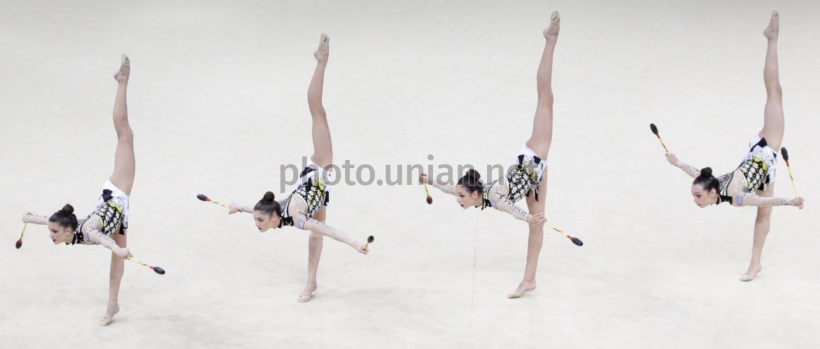 Гимнастки из сборной Греции выступают на чемпионате мира по художественной гимнастике, в Киеве, в субботу, 31 августа 2013 г. В Киеве прошел четвертый день соревнований по художественной гимнастике. Группы гимнасток из 29 стран мира демонстрировали на ковре свое мастерство в упражнениях с 10 булавами, 3 мячами и 2 лентами. "Золото" завоевала сборная Беларуси. Второй результат показали итальянки, третий - спортсменки из России. Чемпионат мира по художественной гимнастике проходил в Киеве с 27 августа по 1 сентября. Фото Евгения Малолетки / УНИАН