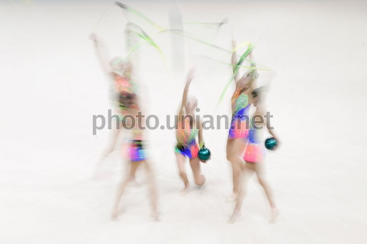 Гимнастки из сборной Китая выступают на чемпионате мира по художественной гимнастике, в Киеве, в субботу, 31 августа 2013 г. В Киеве прошел четвертый день соревнований по художественной гимнастике. Группы гимнасток из 29 стран мира демонстрировали на ковре свое мастерство в упражнениях с 10 булавами, 3 мячами и 2 лентами. "Золото" завоевала сборная Беларуси. Второй результат показали итальянки, третий - спортсменки из России. Чемпионат мира по художественной гимнастике проходил в Киеве с 27 августа по 1 сентября. Фото Евгения Малолетки / УНИАН