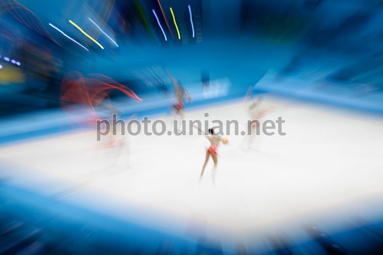 Гимнастки из сборной Испании выступают на чемпионате мира по художественной гимнастике, в Киеве, в субботу, 31 августа 2013 г. В Киеве прошел четвертый день соревнований по художественной гимнастике. Группы гимнасток из 29 стран мира демонстрировали на ковре свое мастерство в упражнениях с 10 булавами, 3 мячами и 2 лентами. "Золото" завоевала сборная Беларуси. Второй результат показали итальянки, третий - спортсменки из России. Чемпионат мира по художественной гимнастике проходил в Киеве с 27 августа по 1 сентября. Фото Евгения Малолетки / УНИАН