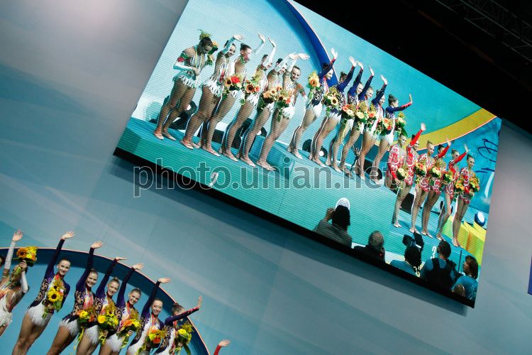Изображение гимнасток из сборной Беларуси (1 место), гимнасток из сборной Италии (2 место) и гимнасток из сборной России (3 место) на экране во время церемонии награждения на чемпионате мира по художественной гимнастике, в Киеве, в субботу, 31 августа 2013 г. В Киеве прошел четвертый день соревнований по художественной гимнастике. Группы гимнасток из 29 стран мира демонстрировали на ковре свое мастерство в упражнениях с 10 булавами, 3 мячами и 2 лентами. "Золото" завоевала сборная Беларуси. Второй результат показали итальянки, третий - спортсменки из России. Чемпионат мира по художественной гимнастике проходил в Киеве с 27 августа по 1 сентября. Фото Евгения Малолетки / УНИАН