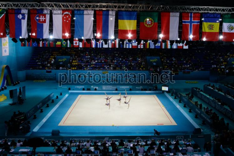 Гимнастки из сборной Беларуси выступают на чемпионате мира по художественной гимнастике, в Киеве, в субботу, 31 августа 2013 г. В Киеве прошел четвертый день соревнований по художественной гимнастике. Группы гимнасток из 29 стран мира демонстрировали на ковре свое мастерство в упражнениях с 10 булавами, 3 мячами и 2 лентами. "Золото" завоевала сборная Беларуси. Второй результат показали итальянки, третий - спортсменки из России. Чемпионат мира по художественной гимнастике проходил в Киеве с 27 августа по 1 сентября. Фото Евгения Малолетки / УНИАН