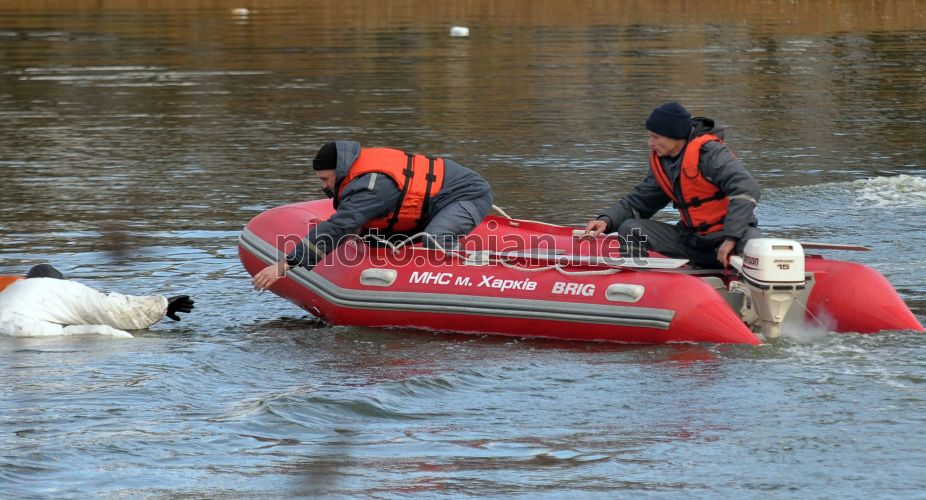 Спасатели во время совместных учений органов управления Харьковской области и сил гражданской защиты по действиям во время ликвидации последствий ЧС в осенне-зимний период в селе Ватутино (Харьковская обл.), в среду, 23 октября 2013 г. Во время учений отрабатывалась ликвидация последствий чрезвычайных ситуаций возникающих при погодных анамалиях осенью и зимой. Фото Владимира Андреева / УНИАН