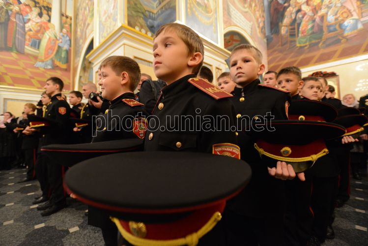 Кадеты во время получения погонов, которые 50 лет назад носили украинские кадеты, в Успенском соборе Киево-Печерской Лавры, в четверг, 7 ноября 2013 г. Передача погонов состоялась в рамках юбилейного 5-го посвящения киевских школьников в кадеты. Фото Владимира Токарца / УНИАН