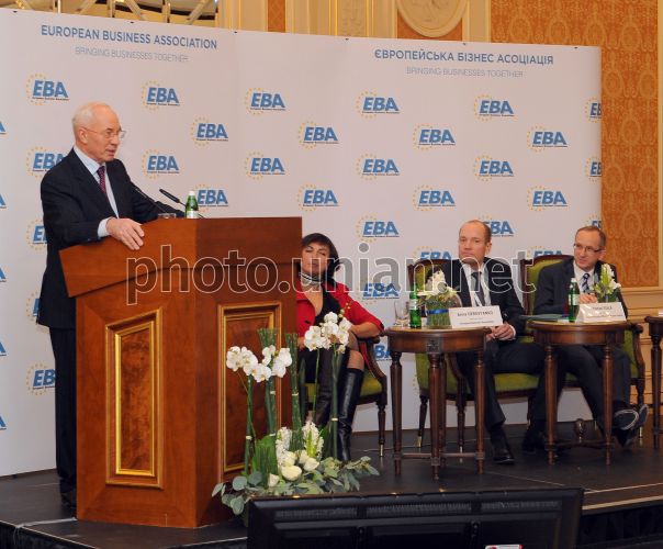 Премьер-министр Украины Николай Азаров на собрании Европейской бизнес ассоциации в Киеве, во вторник, 26 ноября 2013 г. Люди поддерживают решение правительства, направленное на нормализацию торгово-экономических отношений с Российской Федерацией и продолжение подготовки Соглашения об ассоциации с Европейским Союзом. Фото Олега Маркевича / пресс-служба КМУ / POOL / УНИАН