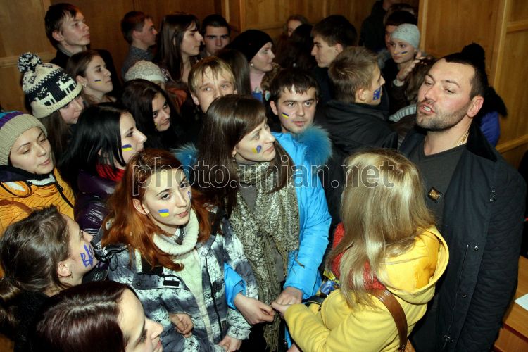 Ужгородские студенты препятствуют выходу из сессионного зала депутату Ужгородского городского совета (справа) после завершения внеочередной сессии в Ужгороде, в понедельник, 2 декабря 2013 г. Фото Яноша Немеша / УНИАН