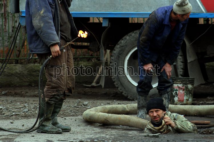 Работники водоканала проводят работы по ликвидации прорыва канализации в Ужгороде, в среду, 4 декабря в 2013 г. Фото Яноша Немеша / УНИАН