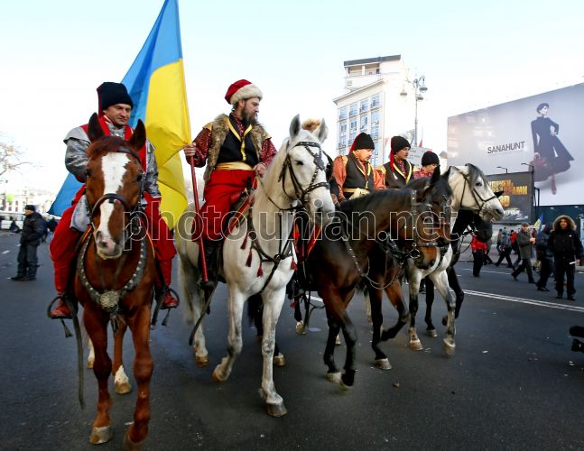 Мужчины в костюмах казаков на лошадях, на Евромайдане в Киеве, в субботу, 14 декабря 2013 г. Около десяти человек в казацких костюмах на лошадях охраняют Майдан Незалежности со стороны Европейской площади, прямо под высокими отстроенными баррикадами. Фото Александра Синицы / УНИАН