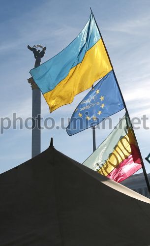Флаги Украины и Евросоюза на Майдане Незалежности в Киеве, в субботу, 14 декабря 2013 г. Около десяти человек в казацких костюмах на лошадях в это день охраняют Майдан Незалежности со стороны Европейской площади, прямо под высокими отстроенными баррикадами. Фото Александра Синицы / УНИАН