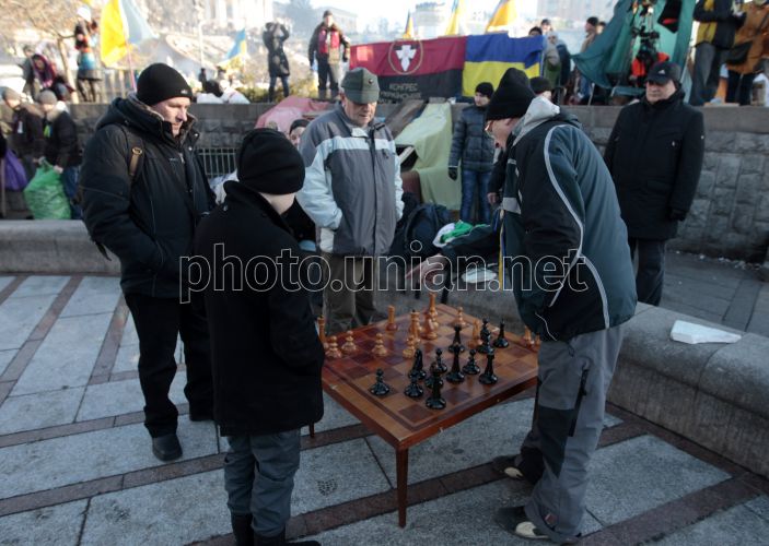 Участники Евромайдана играют в шахматы на Майдане Незалежности в Киеве, в субботу, 14 декабря 2013 г. Около десяти человек в казацких костюмах на лошадях в это день охраняют Майдан Незалежности со стороны Европейской площади, прямо под высокими отстроенными баррикадами. Фото Владислава Мусиенко / УНИАН