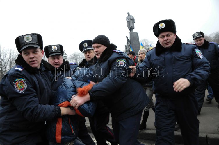 Сотрудники милиции проводят задержание женщины, которая на Евромайдане облила зеленкой оппозиционного политика Юрия Луценко и его жену, народного депутата Ирину Луценко в Харькове, в субботу, 28 декабря 2013 г. В Харькове на Евромайдане оппозиционного политика Юрия Луценко и его жену, народного депутат Ирину Луценко облили зеленкой. Луценко с женой сначала облила женщина, а еще через несколько минут попытку облить оппозиционных политиков повторил мужчина. Обоих нападавших задержали милиционеры. Люди, которые были на месте, начали требовать от работников милиции на месте составить протокол. Участники харьковского Евромайдана даже попытались прорваться к нападавшим. Произошло несколько столкновений. Фото Владимира Андреева / УНИАН