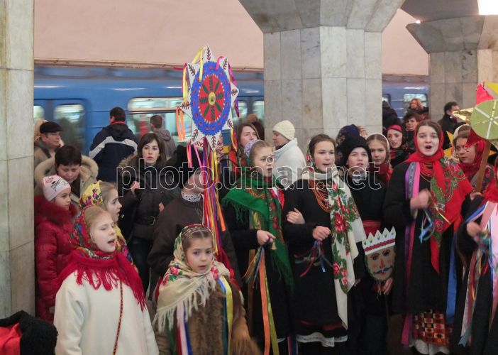 Участники парада Рождественских звезд в метро, в Киеве, во вторник, 7 января 2014 г. Фото УНИАН