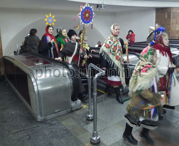 Участники парада Рождественских звезд в метро, в Киеве, во вторник, 7 января 2014 г. Фото УНИАН