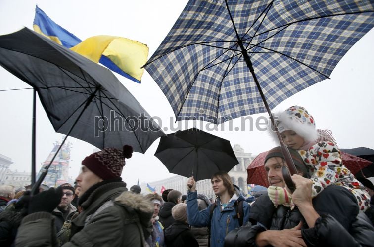 Участники флеш-моба в поддержку российского телеканала "Дождь", в Киеве, в воскресенье, 9 февраля 2014 г. Несколько десятков людей в поддержку этого телеканала устроили на Майдане Незалежности своеобразный флеш-моб, открыв зонтики. Также со сцены Майдана координаторы Народного вече, обращаясь к людям, собравшимся на главной площади столицы, отметили, что в России также как и в Украине, кроме провластных телеканалов, есть оппозиционные, которые подвергаются притеснениям со стороны власти. И украинцы должны поддержать эти оппозиционные каналы и журналистов. Фото Александра Синицы / УНИАН