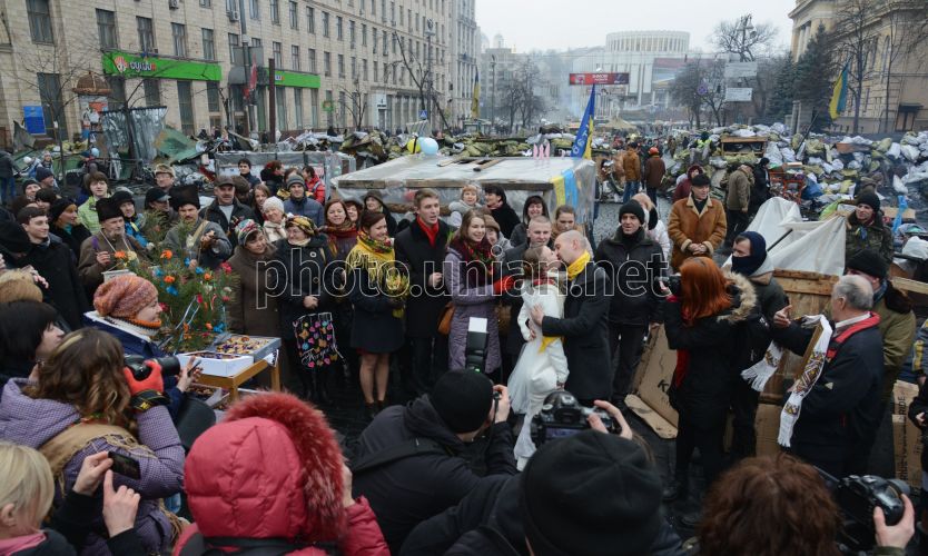 Свадьба председателя исполкома Самообороны Майдана Даниила Клеха и Кристины Крывдык, на улице Грушевского в Киеве, в субботу, 15 февраля 2014 г. Фото Владимира Токарца / УНИАН