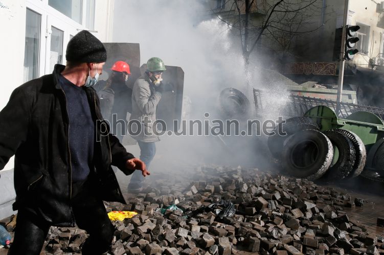 Митингующие бросают камни во время столкновений с правоохранителями на углу Институтской и улицы Садовой, в Киеве, во вторник, 18 февраля 2014 г. Фото Александра Синицы / УНИАН
