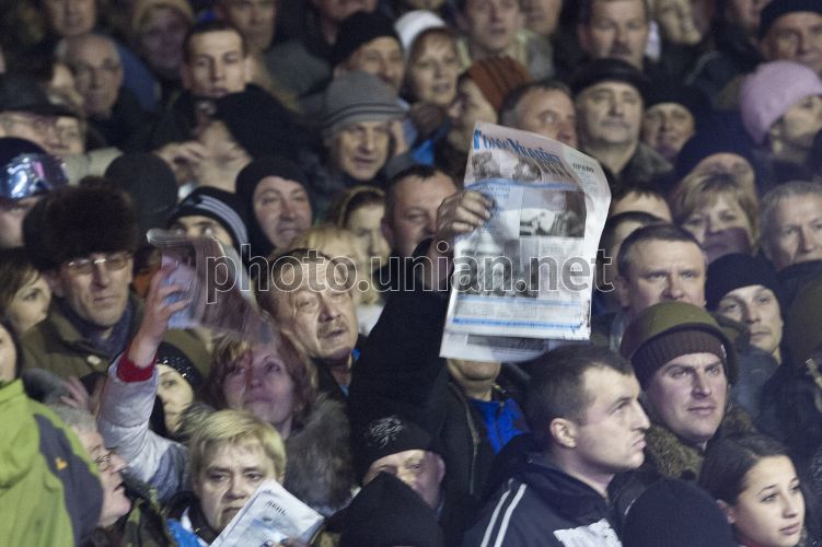 Спецвыпуск газеты "Голос Украины" раздавали митингующим на Майдане Незалежности в Киеве, в субботу, 22 февраля 2014 г. В спецвыпуске "Голоса Украины" напечатаны постановления Верховной Рады про увольнения и назначения представителей власти. Фото Анастасии Сироткиной / УНИАН