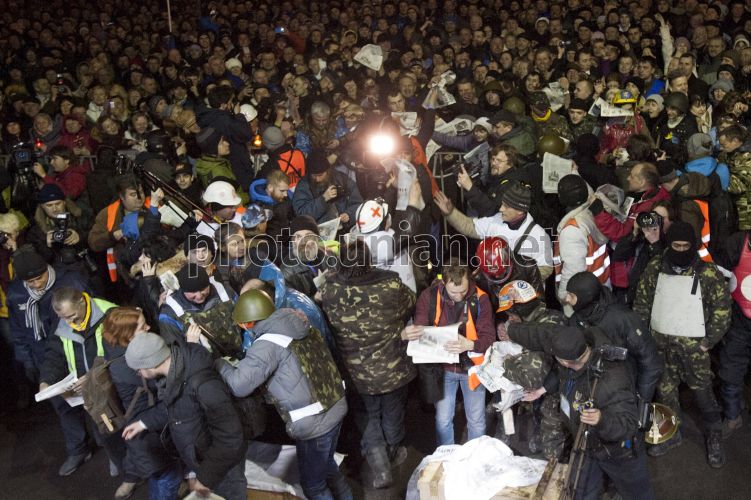 Спецвыпуск газеты "Голос Украины" раздавали митингующим на Майдане Незалежности в Киеве, в субботу, 22 февраля 2014 г. В спецвыпуске "Голоса Украины" напечатаны постановления Верховной Рады про увольнения и назначения представителей власти. Фото Анастасии Сироткиной / УНИАН